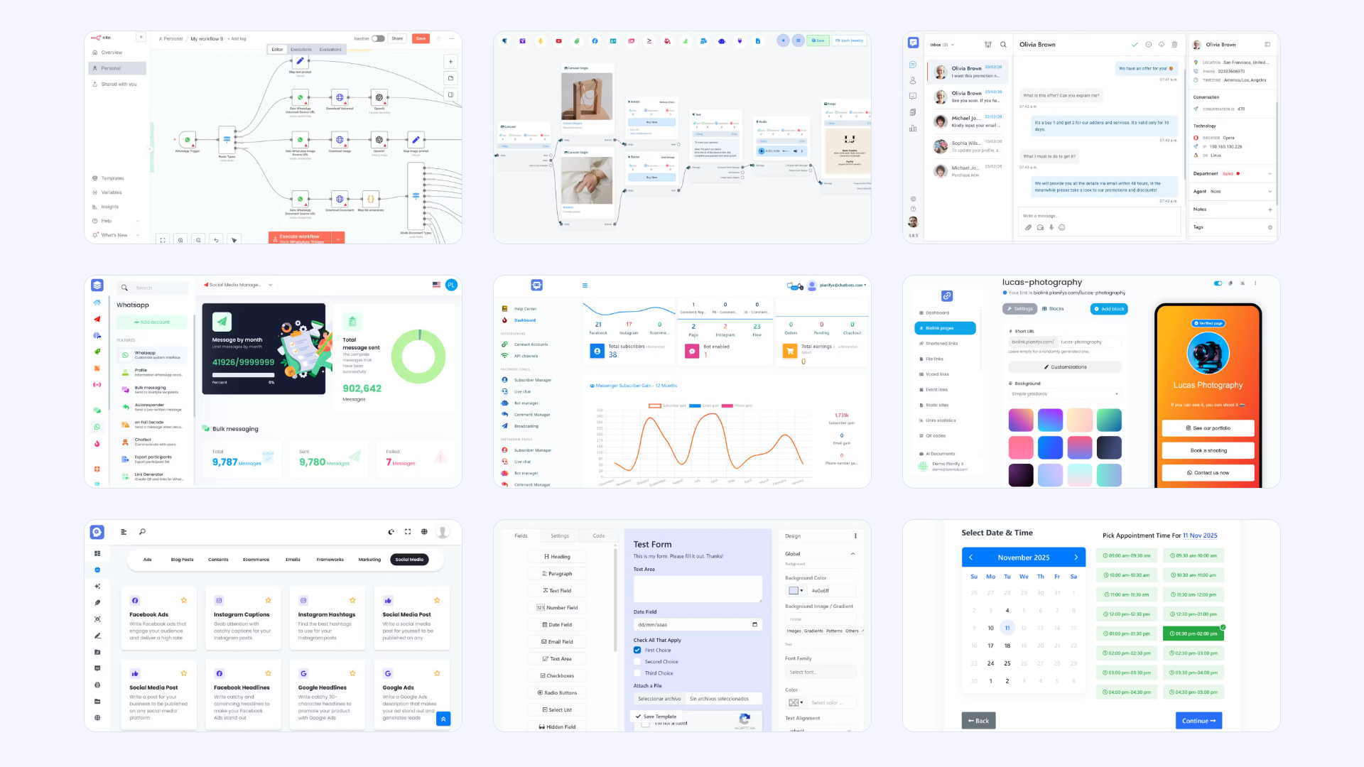 - Cover chat, content, CRM, scheduling, analytics, and more