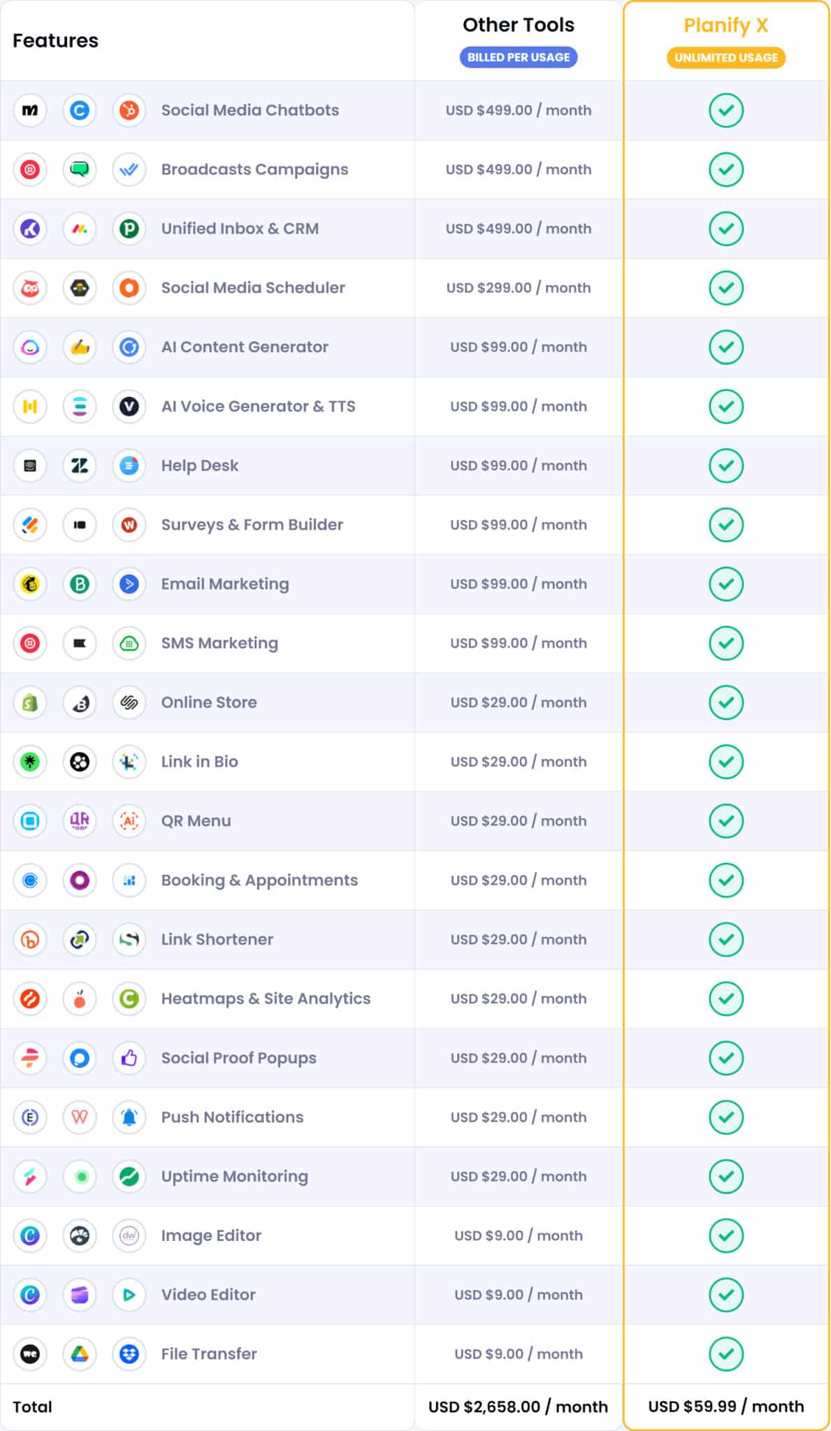 Planify X offers a comprehensive suite of AI-powered marketing and sales tools under one single, affordable subscription. Unlike competitors, all features are unlimited, avoiding additional fees for usage.